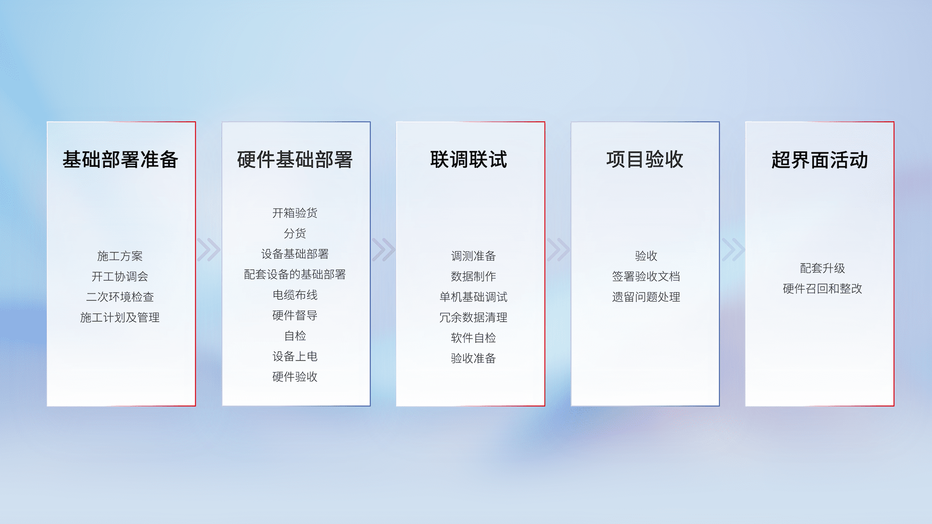 从基础部署准备、、硬件基础部署、、、、联调联试、、项目验收、、越界面活动的全过程可追溯,,,,保证施工质量和进度。。